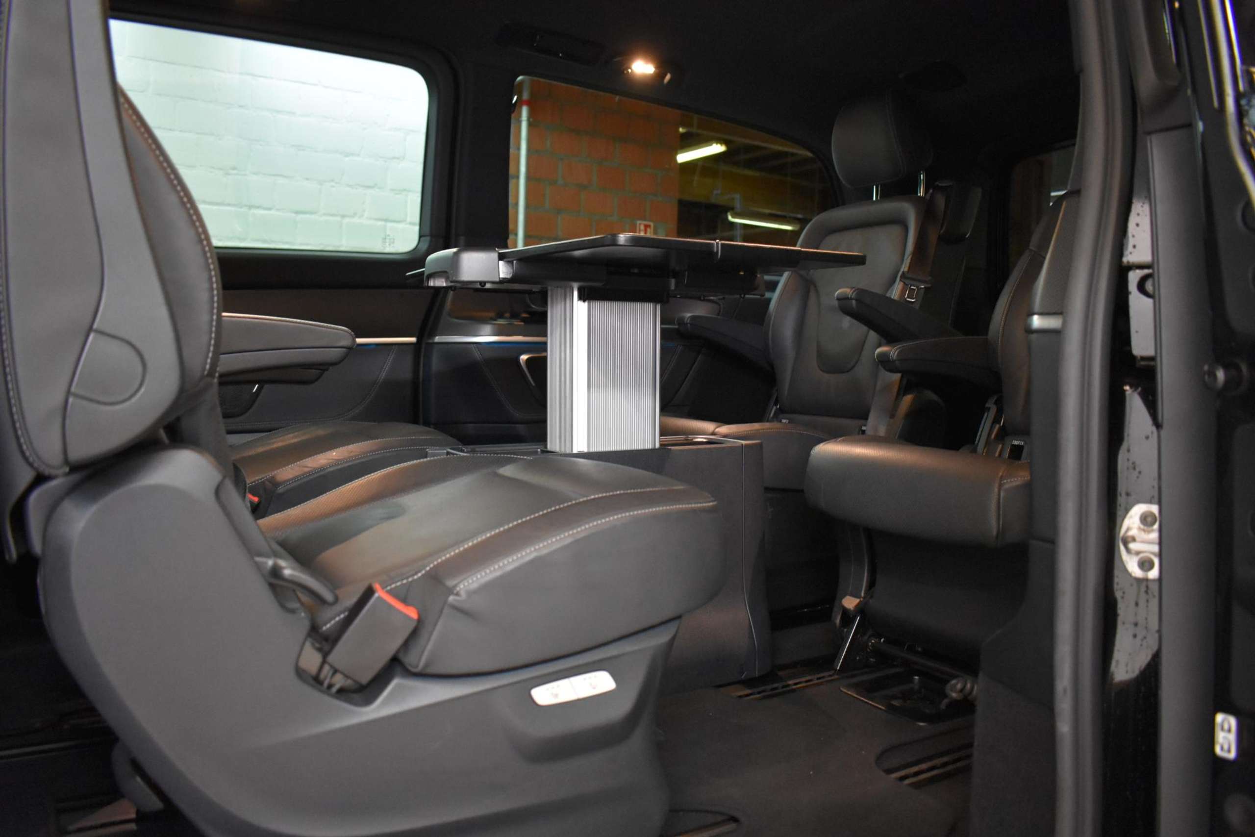 - 2 symmetrische neerklapbare verwijderbare zitplaatsen achterin in de vorm van captainszetels naar voren kijkend zonder elektrische verstellingen met een niet verwijderbaar opklapbaar kussen en een zitting die tot de tafel klapt kantel-/neerklapbaar, manue